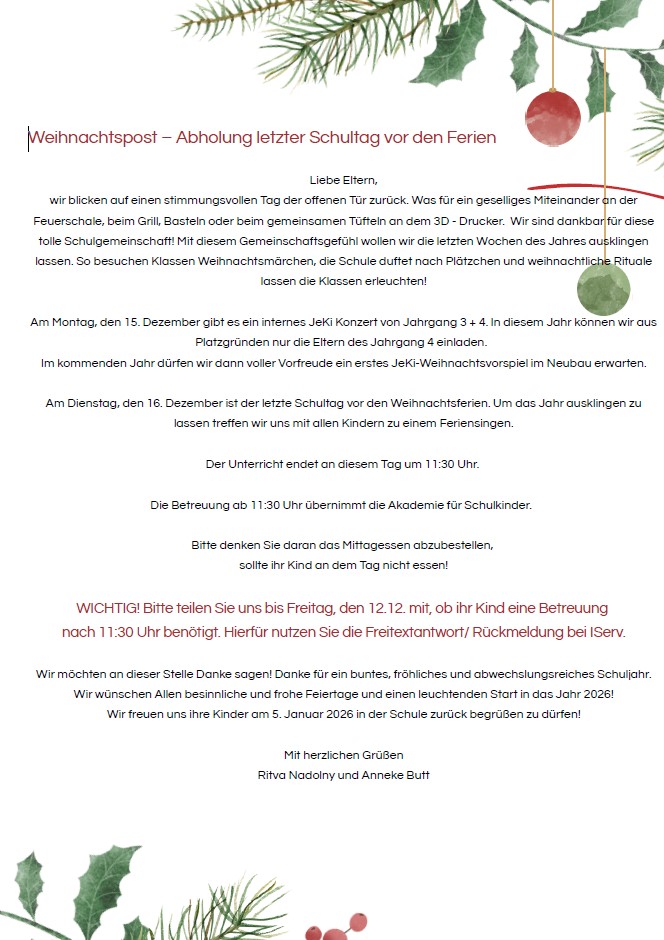 Am 16.12. endet der Unterricht bereits um 11:30 Uhr.